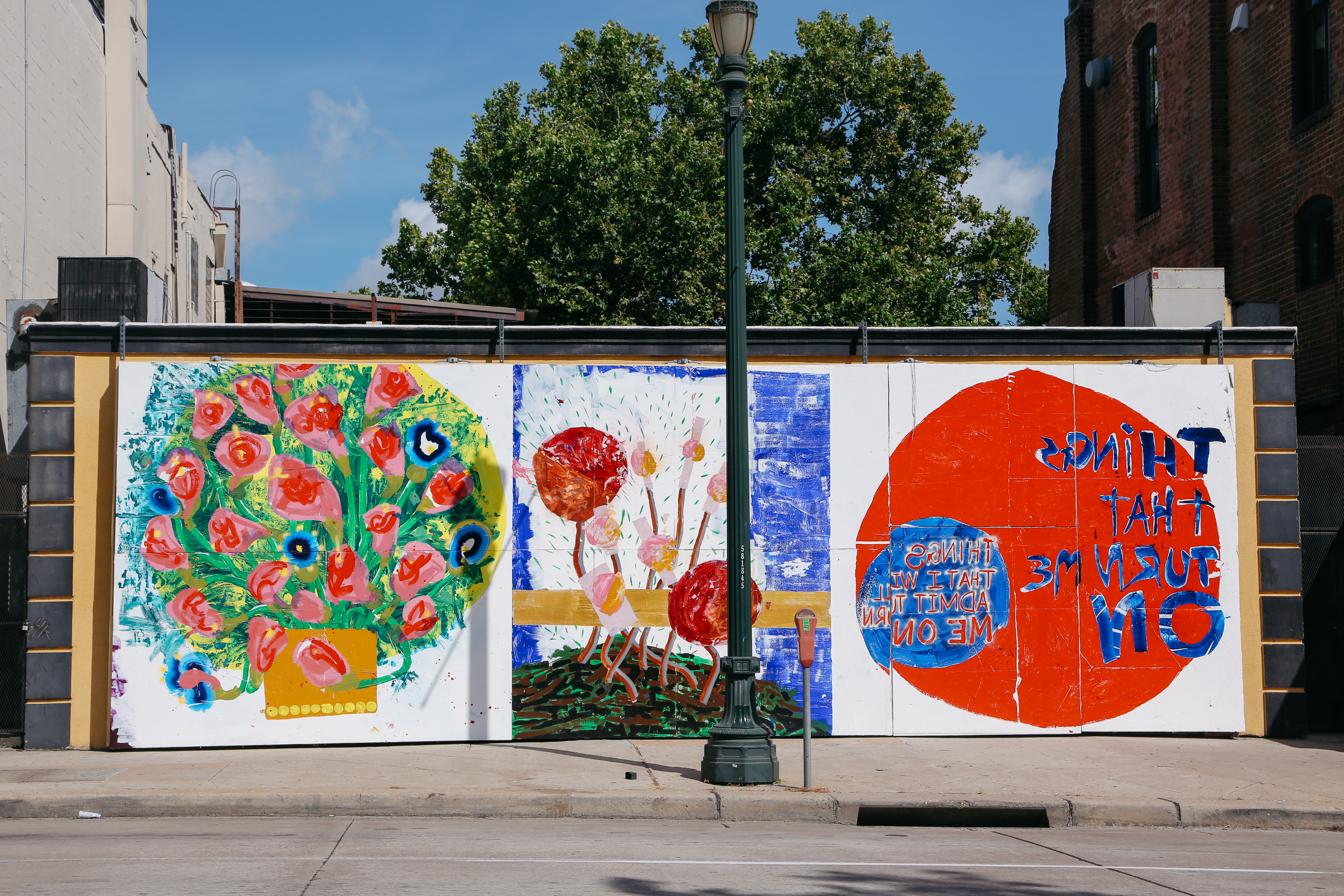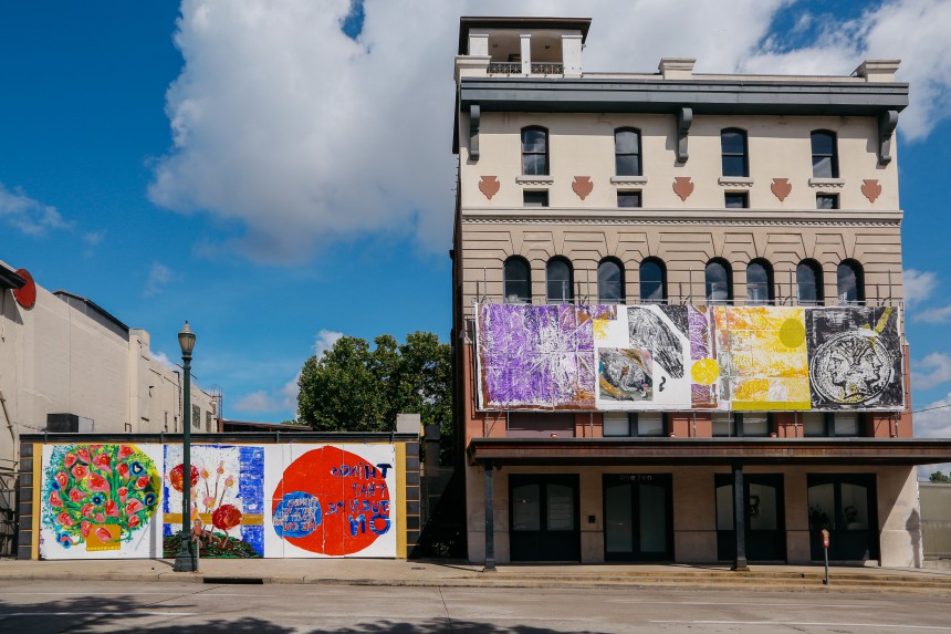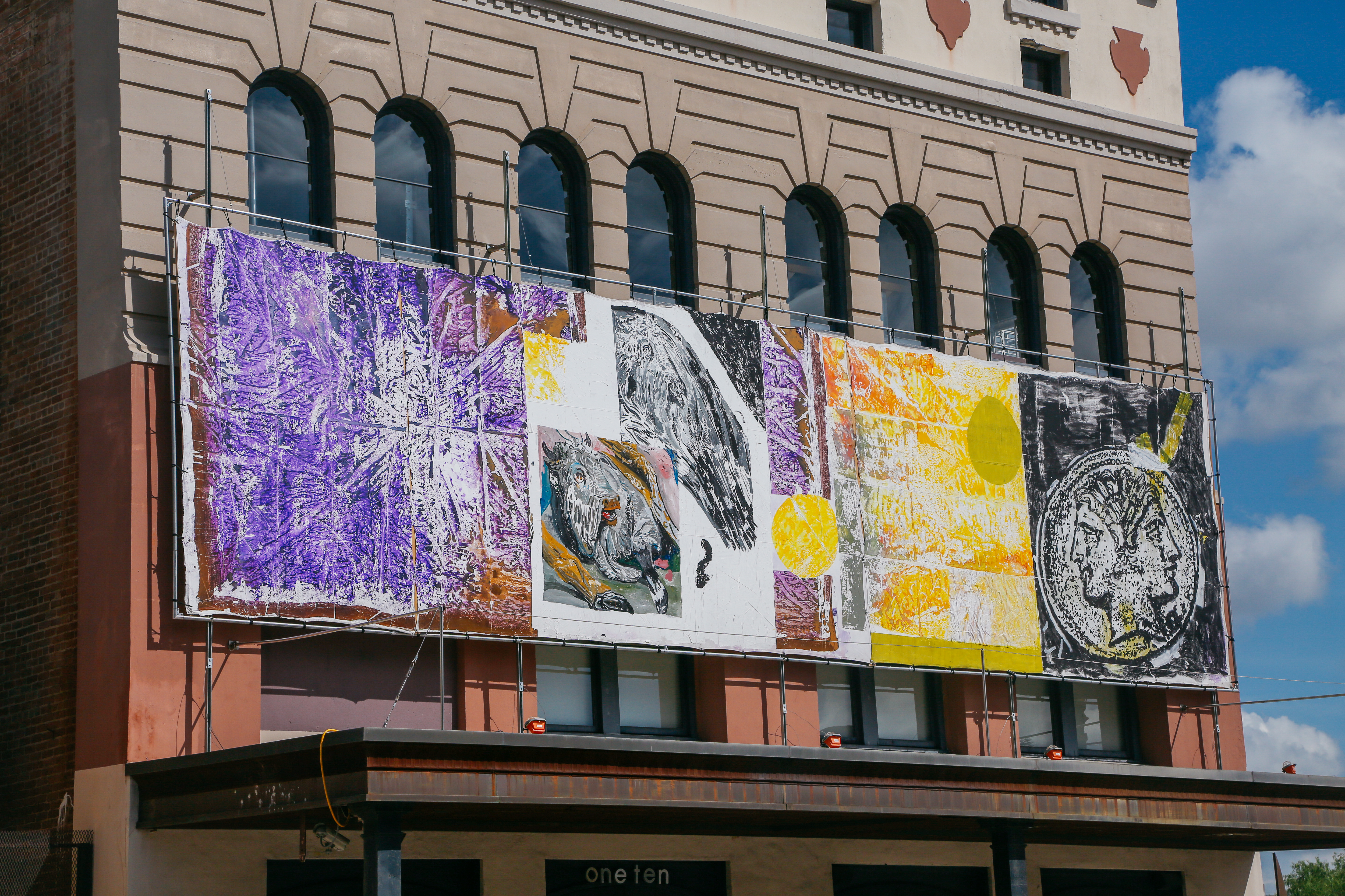 Installation of three site-specific mural-length paintings displayed outside, exposed to the elements during the dog days of summer along the facades of both 110 Milam and 112 Milam.